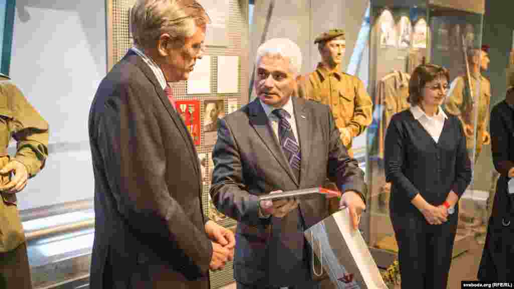Скот Роланд уручае нэсэсар намесьніку дырэктара музэю Юрыю Цыкалу