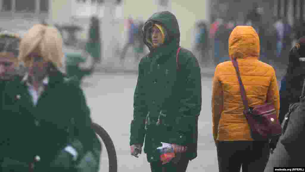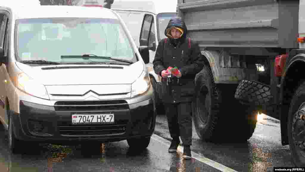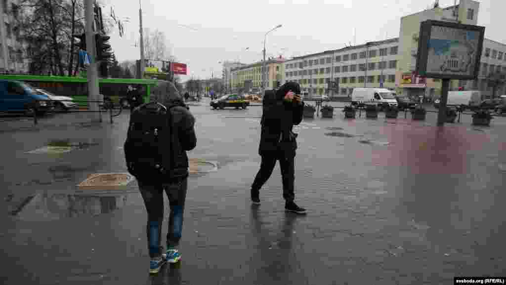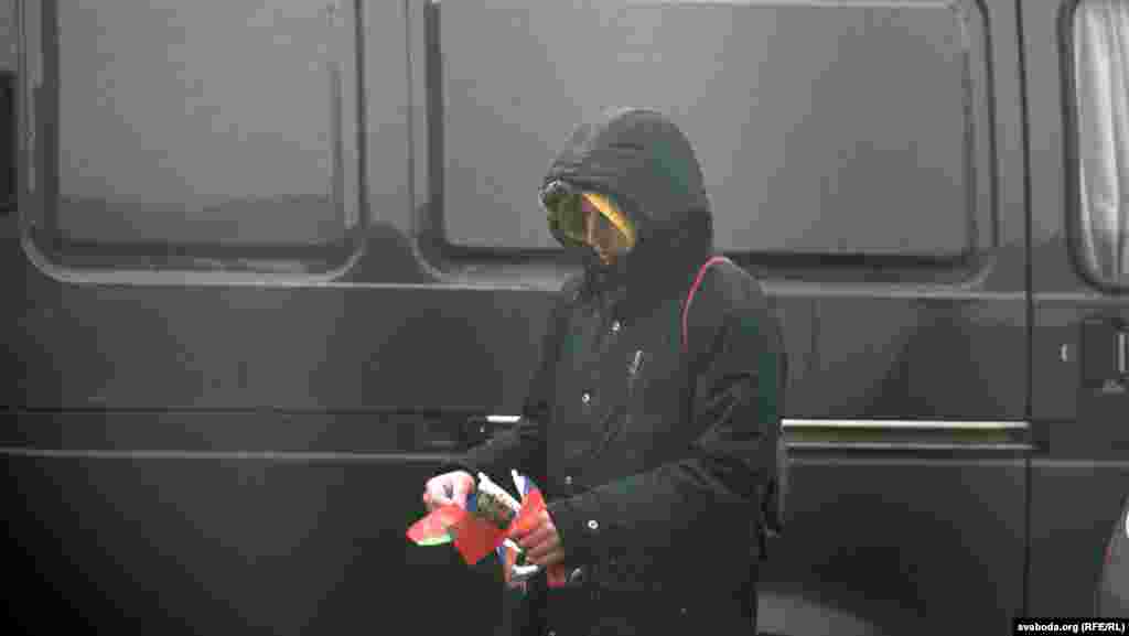 Маладыя людзі спрабавалі раздаваць расейскія і беларускія сьцяжкі на скрыжаваньні праспэкту Незалежнасьці і вуліцы Сурганава. Але пры зьяўленьні фотакамэры пачалі хаваць свае твары, а пазьней увогуле зьбеглі.