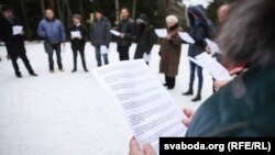 На завяршэньне ўдзельнікі акцыі памяці паставілі каля крыжоў запаленыя зьнічы і прасьпявалі малітоўны гімн «Магутны Божа».