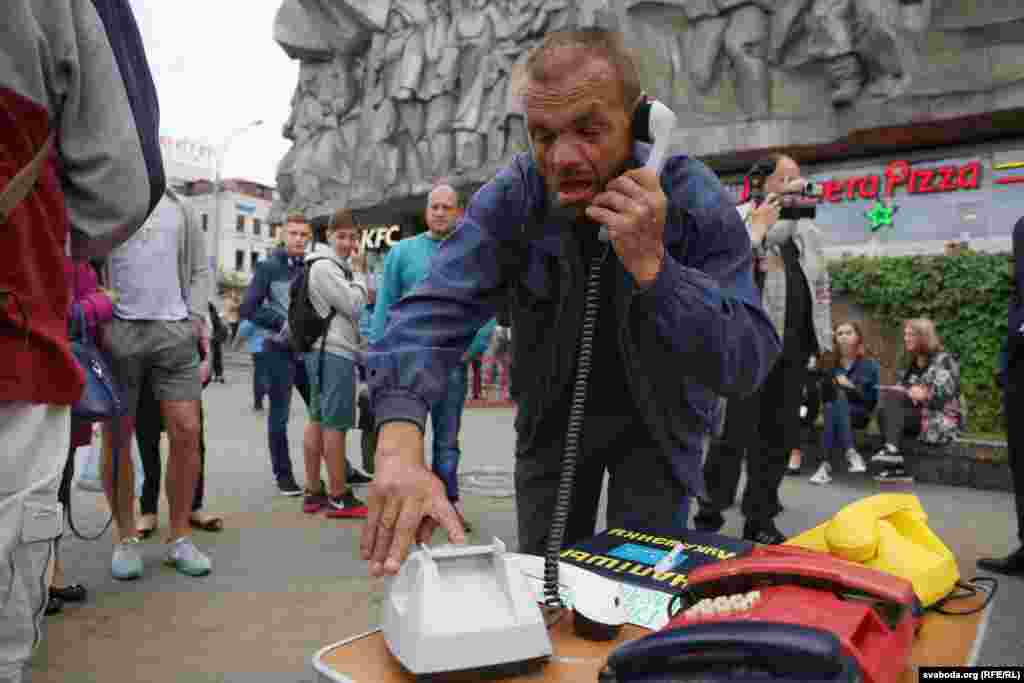 Побач з плякатам «Напішы Лукашэнку. Пазвані. Пажадай» на століку — старыя тэлефонныя апараты: вайсковы, дыскавыя, кнопачныя. Унізе — вельмі старая друкарка з таблічкай: «Актывістам-стукачам». Тут жа каробка ад піцы з надпісам: «Месца спыненага часу. Падарунак Лукашэнку для яго дзетак і ўнукаў».
