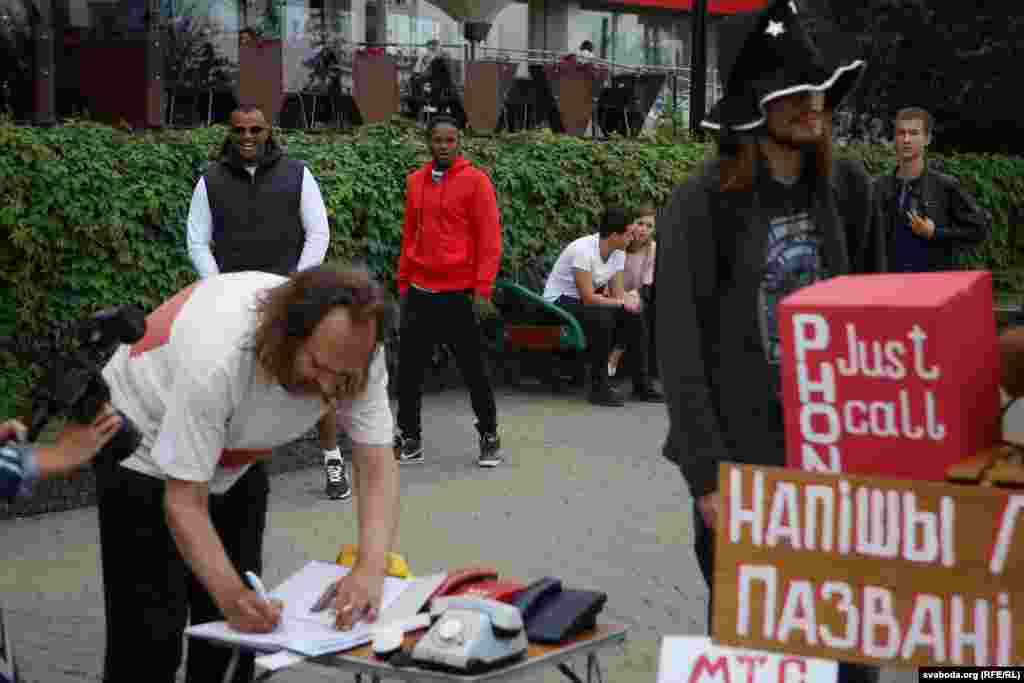 У Менску на скрыжаваньні праспэкта Пераможцаў і Нямігі прайшоў чарговы перадвыбарчы пікет-пэрформанс «Напішы Лукашэнку. Пазвані. Пажадай». Зладзілі яго кандыдаты ў дэпутаты ў Палату прадстаўнікоў Уладзiмер Падгол і Алесь Таўстыка.