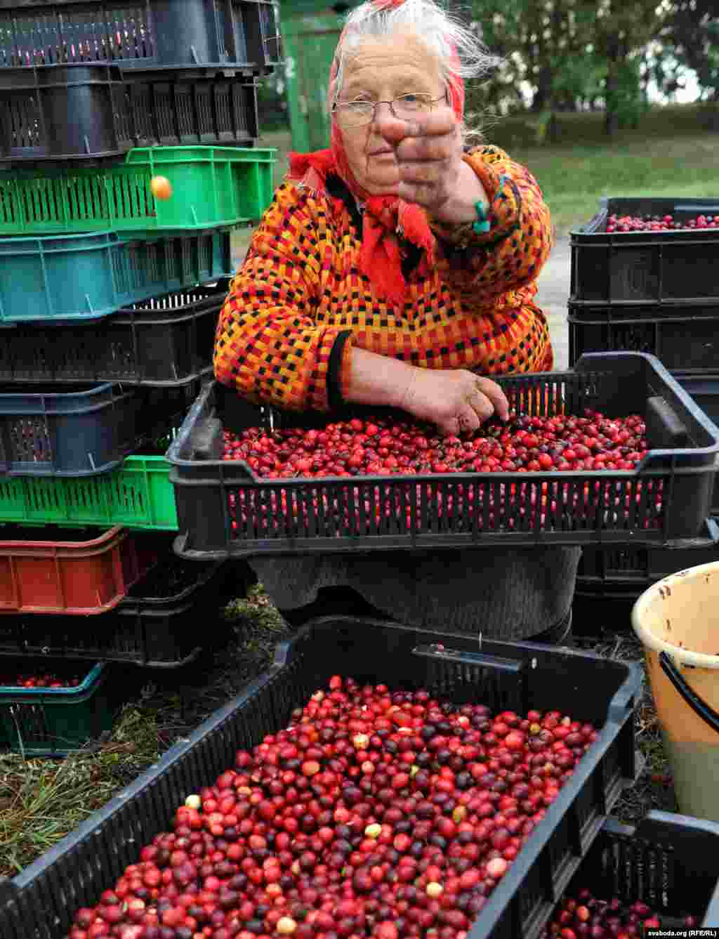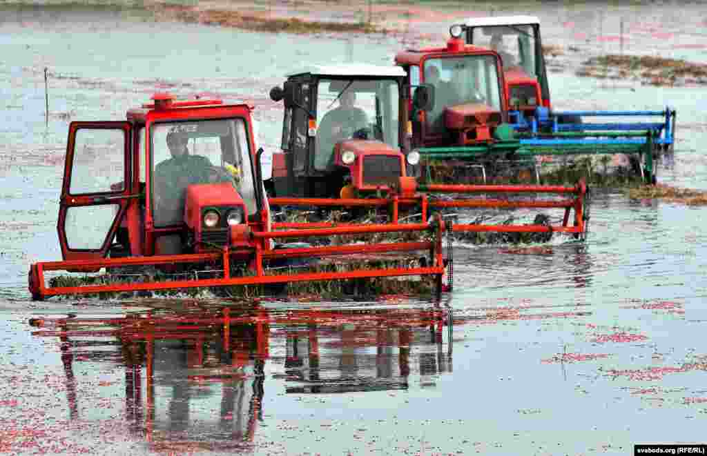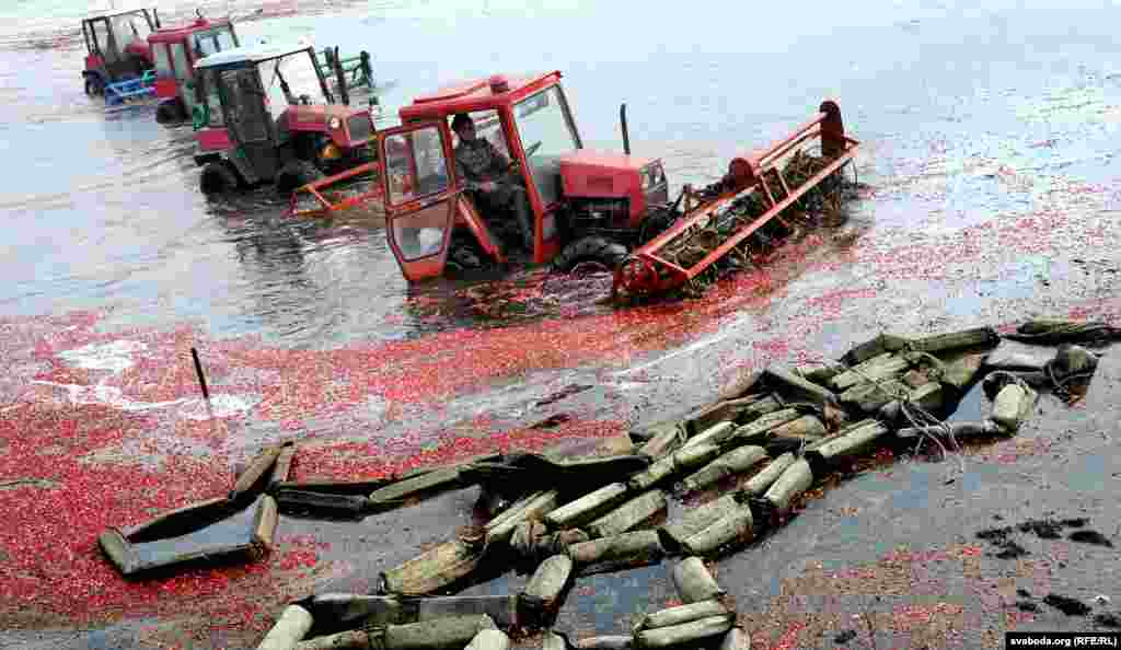 Уручную зьбіраюць на элітных чэках, дзе журавіны лепшай якасьці, каб іх не пашкодзіць. Дзеля гэтага з чэкаў зьліваюць ваду