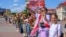 Каля ста дзяўчат сталі ў ланцуг у белым адзеньні і зь белымі і чырвонымі кветкамі каля аўтавакзалу ў Горадні.